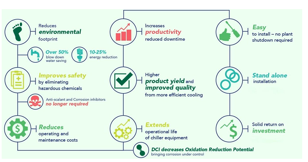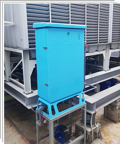 DeCaIon™ (DCI) is a revolutionary approach to eliminating scale, preventing corrosion and bio-fouling automatically in cooling water systems. Through applied electro-chemistry and an intelligent controller, DCI removes water hardness from cooling systems without the need for hazardous chemicals. The innovation provides a green technology solution to scaling and corrosion in large building HVAC systems and industrial chiller circuits. The DCI system removes existing scale deposits and prevents further scale formation by driving a non-spontaneous redox reaction which precipitates CaCO₃ and Mg(OH)₂ at the cathode.
