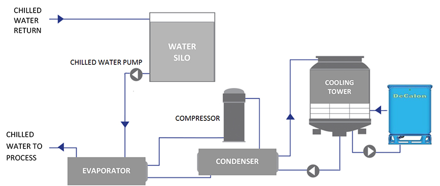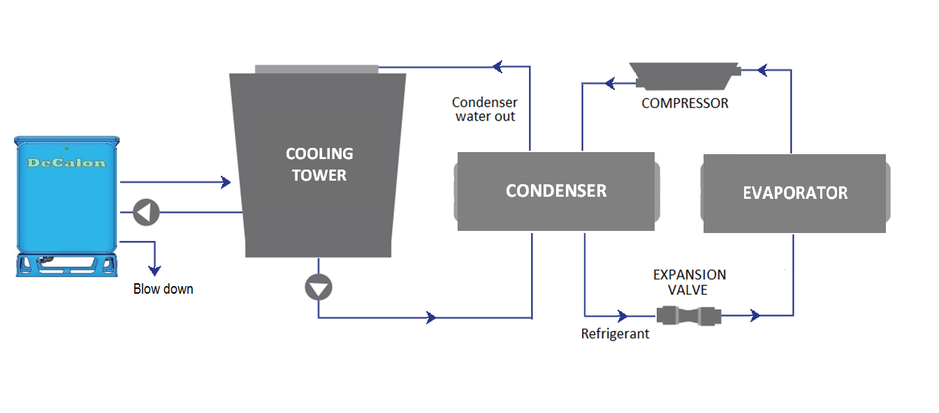 The main causes of scaling, Ca²⁺ and Mg²⁺, can then be dumped off the recirculating cooling water. SiO₂ is also removed. The system operates continuously so design heat transfer efficiency is maintained at all times and the requirement for routine shut downs and chemical descaling is no longer required. Water blow-down quantities are also substantially reduced.